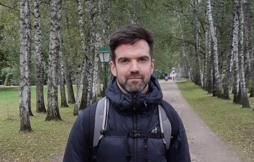 In Russia, my translator and coordinator was Matthew Casserly, an American expat working in Moscow. I didn’t have my smartphone with me in Russia, for security reasons, so Matthew sent me this photo of himself outside Tolstoy’s estate, Yasnaya Polyana: