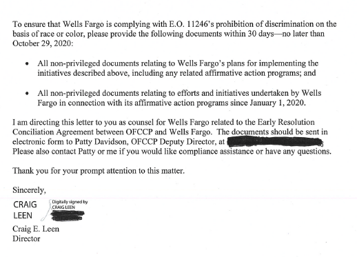 The Labor Department’s letter to Wells Fargo announcing the investigation says it was triggered by this June statement by the bank’s CEO Charles Scharf. Excerpt: