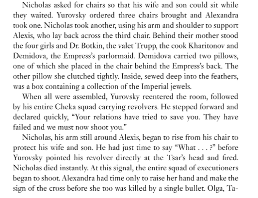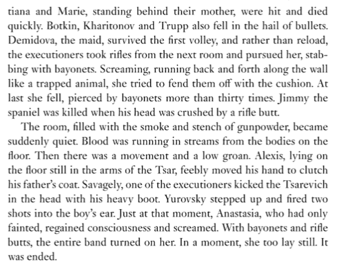 You think? Here, from historian Robert Massie’s great book Nicholas and Alexandra, is how the little Romanov children, their parents, and a handful of servants met their end in the basement of the Ipatiev House in Yekaterinburg: