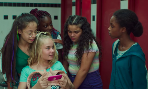 I apologize, but I have to be blunt here. I blacked out the offensive word in that screenshot above. It’s a screengrab from a scene in Cuties, in which the protagonist, Amy, is in the stall in the girls bathroom at school, listening to the Cuties — four other 11-year-old girls — describing in detail a porn clip they are watching and giggling at. Here they are when Amy emerges from the toilet: