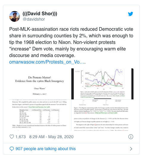 I mentioned in my earlier post the incident from early summer in which an email list of Democratic party data professionals had driven David Shor, an Obama administration data whiz, out of the group because of his “racist tweet” (Shor had simply linked to an academic paper showing that violent protest helps Republicans but peaceful protest helps Democrats). I brought it up as an example of this bizarre attitude many on the left have of resenting information that doesn’t confirm their preferred narrative about the protests. But until I read it just now in Andrew’s column, I had forgotten about this:
