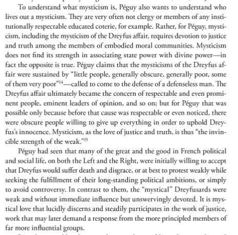 The conditions of social separation and anomie that led to ultranationalist populism exist today, of course, and, I think, account for the increasing radicalization, on both the Left and Right, of our politics. What I would like to know, and that this new biography can answer, is why Péguy thought late modernity worth defending, given that it is responsible for the disenchantment of the world, and the exorcism of mystique from the body politic.