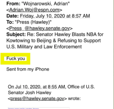 A very woke reporter for the very woke ESPN was not so impressed. Adrian Wojnarowski, a top ESPN basketball analyst, responded to Hawley: