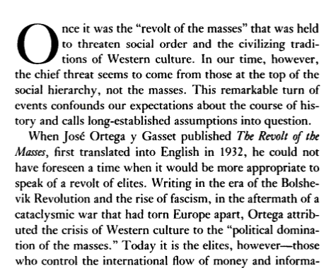 Rob G., a reader of this blog and frequent commenter, often recommends Christopher Lasch’s posthumously published 1995 book The Revolt of the Elites and the Betrayal of Democracy. Lasch wrote as a man of the Left, but like Wendell Berry and Philip Rieff, his insights have been absorbed and championed by the Front Porch Republic tribe on the Right. I’ve been thumbing through my old copy of Lasch this morning (it’s interesting to see what I underlined when I first read the book in the 1990s). That book is even more relevant today than it was when it first came out twenty-five years ago. Here’s the opening chapter: