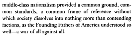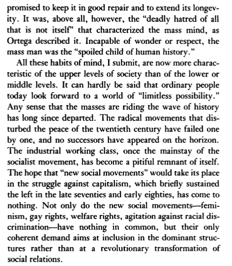 You will surely want to read the whole thing. Again, the historian Lasch writes from the old-fashioned patriotic American left. This book is a curious thing: something that sounds like a volume from a lost world (which it is), and simultaneously a book that could have been written about events of the past few months.