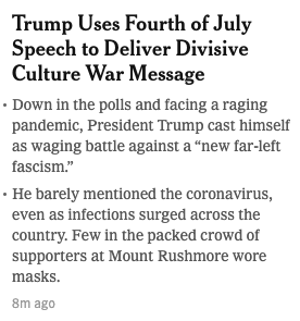 UPDATE: So, I watched Trump’s speech at Mount Rushmore. Of course I agreed with all of it. It was a powerful speech, though he seemed weary delivering it. His lines about how we will never let the left tear down the monuments were great, but the delivery was entirely flat, as if he didn’t really believe it. I got more of a punch from the speech reading The New York Times‘s presentation of it on their front page: