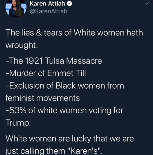 Karen Attiah holds one of the most privileged jobs in American journalism, and she’s using her platform to justify hatred and to come right up to the point of stoking vengeance on an entire class of people, only because of their sex and the color of their skin.