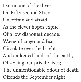 Read this poem by W.H. Auden — September 1, 1939 — about the start of the Second World War. It feels very contemporary. Here’s how it starts:
