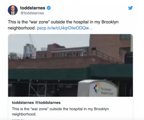 Starnes has emerged as a leading Covid denialist. [UPDATE: He vehemently denies this — see below. I am pleased to learn that it isn’t true, and happily retract the claim. — RD] From NBC News, a report about how Starnes tweeted video of no activity outside a Brooklyn hospital, and framed it as a sign that Covid is a hoax: