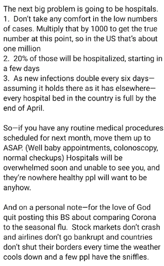 He said nothing about the critical-care crisis facing hospitals. I have found that this is a point that is not widely understood by the general public: that even if only a relatively small number of people are ultimately going to die from this virus, it stands to overwhelm our hospitals. This is why it is so very important for everybody to practice social distancing and the rest: to slow the rate of infection, and give our health care system the chance to cope. It is beyond comprehension why he didn’t make this clear to listeners tonight. I’ve had a number of conversations these past few days with people who aren’t following the story closely, and they are entirely unaware of this fact. The president blew an opportunity to explain that to the nation