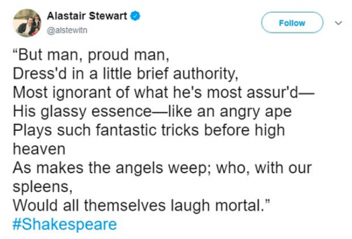 Why do I say this was an extraordinary week? Well, let’s go to Murray, who asks, “Will no one resist the new totalitarianism?” He writes about the fate of Alastair Stewart, a veteran, and much beloved, English broadcaster who was sacked this week after four decades of service. Stewart’s firing offense was quoting Shakespeare at a hostile Twitter follower, who took it as racist. The tweeted-at is a black Briton, who interpreted this passage from the Bard, cited by Stewart, as a racial attack: