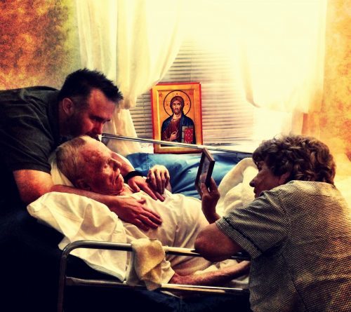 The next year, in the spring of 2015, my Dante book appeared. As you can read in the paperback version, with its extra chapter, my father, who had entered home hospice care, and I were able to reconcile at a deep level. It was through God’s grace, and what He had taught me through Dante. I lived in the bedroom with my dying father during the last week of his life, nursing him, reading to him, and being with him as he drifted towards eternity. Here is my mother and me, comforting him in his last days. She is showing him a photo of his daughter Ruthie, telling him to be brave, that he will see Ruthie soon.