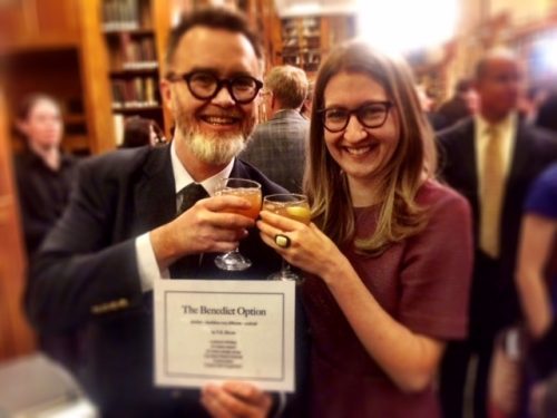 Here, by the way, is Bria Sandford, the editor of The Benedict Option, and me at the New York launch of the book. I’m holding the recipe for a cocktail T.K. Bloom invented for the occasion. Sorry the filter was apparently on when this was taken.: