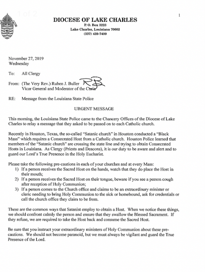 There are blasphemous photos from the black mass available online. I’m not going to post them here. I don’t like giving these creeps publicity, but I do so because the following urgent letter went out from the Catholic Diocese of Lake Charles (which is on the Texas border, not far from Houston) to all priests and extraordinary ministers of the Eucharist, based on information received from the Louisiana State Police: