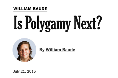 See this piece (“Polyamory Works For Them”) from August in The New York Times. Type in “polyamory” on the Times website, and you’ll get lots of results. I found this one just a few weeks after the 2015 Obergefell decision: a column arguing that now is the time to legalize polygamy: