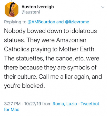So the Pope now affirms that these statues were meant to represent the Incan fertility goddess. Useful to know. He went on to say that they might be displayed at the final mass of the Amazon Synod on Sunday.