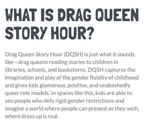 So what’s the ideology? From the “about” page at the Drag Queen Story Hour site: