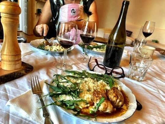 I came back to the hotel to do some work on the speech I’ll be delivering on Friday in Budapest, and then later headed over to Timo’s for dinner. (Remember Timo and his wife Petra from earlier this year?) I got to meet his new son, Baby Elias. Here’s a VFYT from the Krizka family table. That’s Elias sleeping in the Baby Bjorn on Mama Petra’s chest. The wine was homemade, and delicious. The arugula on the risotto was from their own garden: