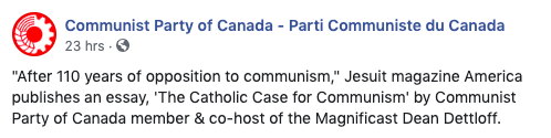 Dettloff is a Catholic — America‘s Toronto correspondent — and a member of the Communist Party of Canada. From the CPC’s Facebook page: