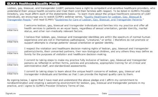 Here’s the GLMA Healthcare Equality Pledge. Excerpt:
