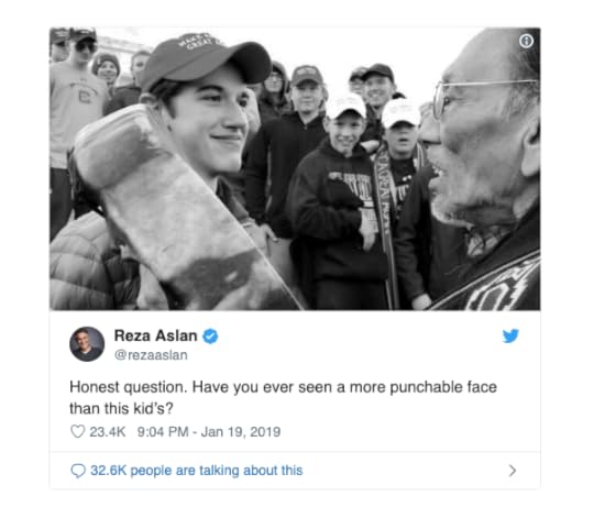 I just checked his Twitter account, and he has said nothing about Antifa’s attack on Andy Ngo. Mind you, Reza Aslan is not obliged to comment on everything that happens. Still, it’s interesting to compare the reaction of individual progressive writers and commenters, as well as media organizations, to the undeniably true Ngo beating, versus the fake allegations lodged against these high school boys.
