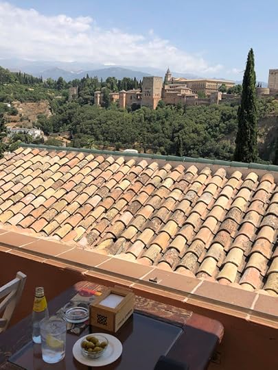 G&T and olives on the terrace overlooking the Alhambra Palace in Granada. The square-ish Renaissance style building contrasting with the surrounding Moorish architecture in marking European religious wars between Christianity and Islam. Interesting contrast with the contemporary conflict between anti-religious forces of liberal secularism and faith.