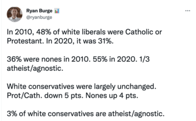 In 2020, a white liberal is TEN TIMES more likely to be an atheist or agnostic than a white conservative.