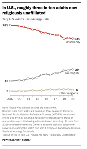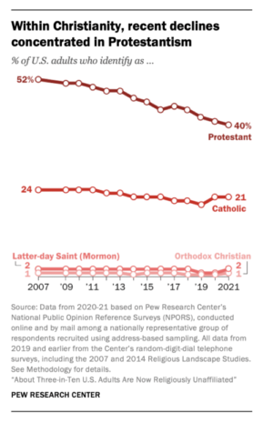 That is, a 36 percent decline in average Sunday attendance in just nine years — with a 15 percent decline in a single year, which might indicate Covid skewing the numbers.