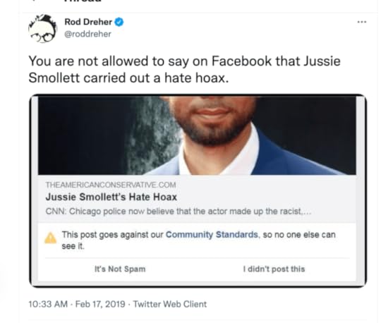 Actor Jussie Smollett has been found guilty on five of six felony counts of disorderly conduct for making a false report to Chicago police that he was the victim of a hate crime in January 2019, an attack prosecutors said he staged.The jury of six men and six women deliberated for more than nine hours over Wednesday and Thursday.A disorderly conduct charge for a false crime report is a Class 4 felony and punishable by up to three years in prison and a $25,000 fine. Cook County Judge James Linn will have discretion in imposing a concurrent or consecutive sentence for each count at a later date.In 2019, when this all first happened, Facebook would not allow people to say what that Chicago jury found today was true. Facebook blocked people posting a commentary from me calling Smollett’s claims a hate hoax: