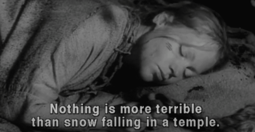 When Theophanes utters his line about snow in the temple, in the original Russian he means “terrible” in the sense of “awe-inspiring”. Why is it awe-inspiring to see snow falling in a temple? Because it means that there has been a terrible breach in the world, and a defilement of what is holy. Yet snow is light and lovely, and graceful. The fact that grace can come through the radical brokenness of the world is “terrible” in the sense of awe-inspiring. It is no accident that Tarkovsky focuses on Duroshka when Theophanes utters these words. She is, for Andrei, the snow that fell through the crack in the cosmos. He saved her from rape, and now he must care for her — and does. She is innocence. This vulnerable, weak, simple-minded girl is holy fool — a manifestation of Christ, and an opportunity for Andrei’s redemption. He cannot repair the world — but he can protect and care for this little one.