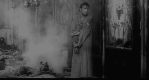 Andrei, shattered by what he has seen — mass murder, sacking, and even the destruction of all his work in the cathedral — and by his killing of a Russian who was assaulting a woman, says he will take a “vow of silence.” Not only will he never again speak, he also will no longer create icons. The suffering and wickedness of the world is too great. Theophanes gently suggests that this is a bad idea. The two men are standing in front of an iconostasis (icon screen) that has been burned by the barbarians, and Theophanes tells Andrei that the destruction might last forever.