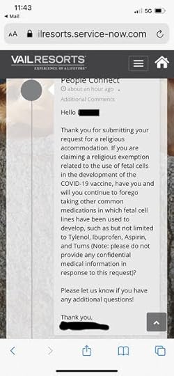 I’ll get straight to the point, because I hardly know where to begin. My sister-in-law works for Vail Resorts, which is imposing a vaccine mandate on its employees. Her coworker, whose name I am protecting because I don’t want to jeopardize her job any more than it already is, applied for a religious exemption. The co-worker received this very odd and intrusive reply, a screenshot of which I’ve attached.
