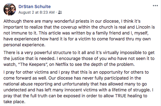 Schulte told me in the 2018 interview (linked in the previous sentence) that the Lincoln diocese was still at the time not being forthcoming with the public about why his uncle was no longer in ministry: