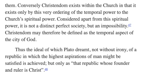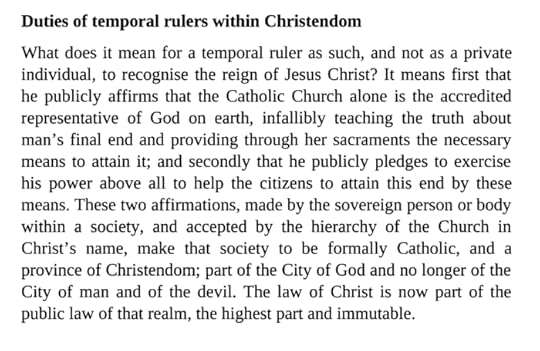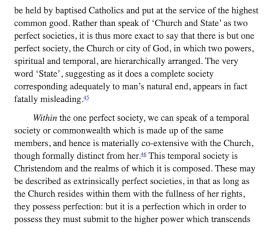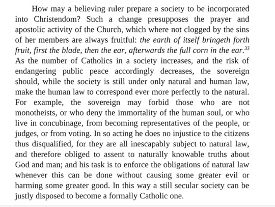 Anyway, I encourage you to read the entire book. It makes it very clear why integralists like to keep their discussions of what they believe at a very general level, using inoffensive terms like “political Catholicism” (Sohrab’s preferred description), “common good conservatism,” and saying that they seek a political order based on helping man achieve the Good. Those things all sound good, but the devil is very much in the details.