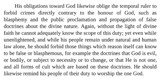 So the people have no right to choose their own leaders, but it might be prudent to let them act as if they did. Got it. As for religious liberty, here’s what the temporal ruler should and should not do: