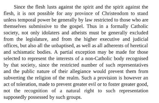 By forbidding those people who aren’t Catholics from voting, the temporal ruler will encourage people to become Catholic. That’s the idea. It doesn’t seem to have occurred to the integralists that this would stir up rebellion by those who do not want to be ordered around by the Catholic Church, or be made second-class citizens in their own country.