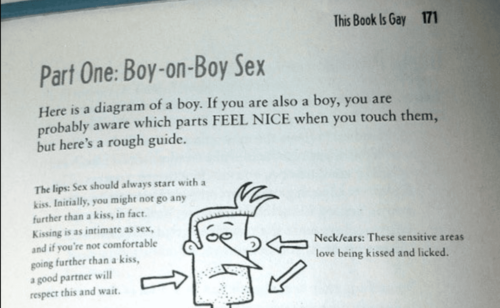 One of you readers sent me a link to an interview that the parents’ rights group Mass Resistance did with a librarian about the book being available for kids. Here is an NSFW page in which Mass Resistance presents photographs taken from the book, which instructs (with drawings) young readers how to have gay sex, including anal sex, oral sex, and mutual masturbation. Here’s a safe snapshot: