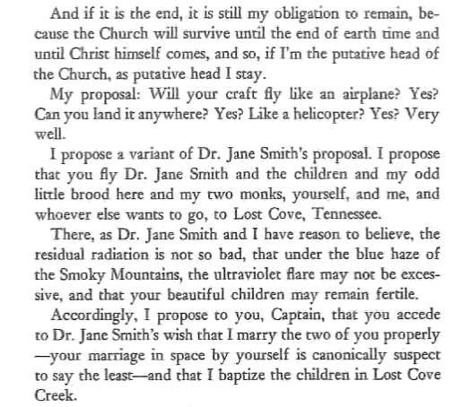 From Lost In The Cosmos, this proposal from Abbot Leibowitz, concerning a post-apocalyptic settlement. For all he knows, the Pope did not survive the nuclear holocaust, nor did any bishops; he might be the pope: