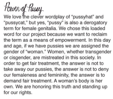 So, wait a minute, penis-havers who present as women should also wear pussyhats for the sake of standing against those who would take away their pussies, which they don’t actually have, and which Pussyhat Progressives, by declaring biology only incidental to womanhood, have given away in the first place?