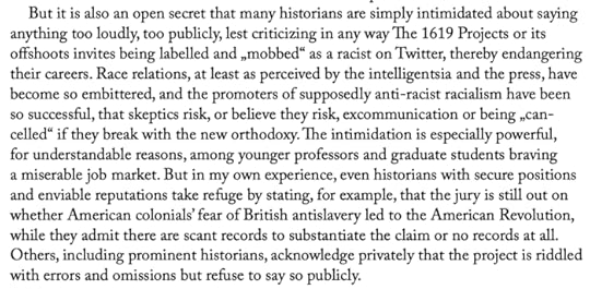 The creation of tyranny. This is an extremely important point. In Live Not By Lies, I cited the 1619 Project and its defenders as an example of the kinds of ideological falsifications of history that are common in totalitarian, or pre-totalitarian, societies. The fact that virtually the entire academic and media elite in the US is willing to pretend that the 1619 Project is true (because it advances a cause they believe in) is staggering testimony to corruption. In my previous post, I called out Donald Trump and his campaign for allowing the “stop the steal” narrative to go forward even though an internal memo reveals that they had concluded the claims were baseless. And now we see the same thing from the Left, though this one is far more consequential. When you have professional historians afraid to contradict what they know to be a lie, and when you have both academia and the media collaborating to defend a politically useful lie, you know the rot is deep. The corruption in that case is not just from a single politician and those around him, but with entire institutions vital to liberal democracy.