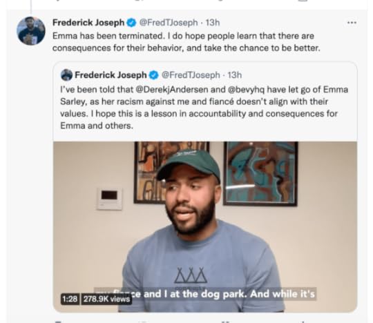 It started with Frederick Joseph, a NYT bestselling author of a book called The Black Friend: On Being A Better White Person. No doubt it was inhaled by the baizuo, who treated it like Holy Writ. Anyway, this is what happened to Joseph over the weekend: