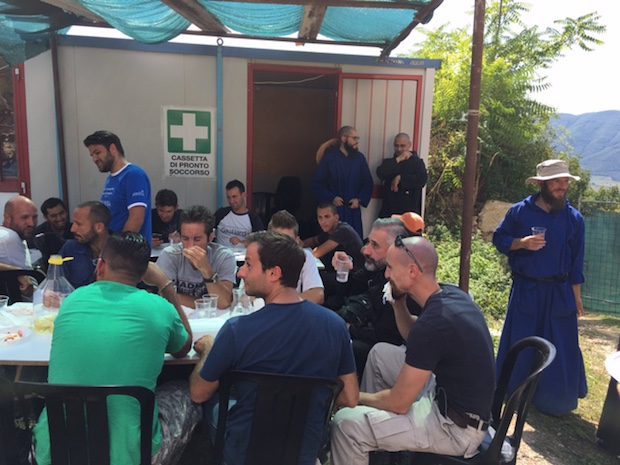 Monks have been making rounds in these days to the various tendopoli, that is, to camping centers with military grade tents for families who have lost their homes. It is becoming clearer that most of the damage was done in the countryside around Norcia to the homes of farmers and tradesmen (often those who have the hardest time making ends meet, but a resiliency to rebuild and the skills to do it). Our general contractor, a wall mason named Piero who has become like a brother to many of the monks, has his 2 sons, wife and mother-in-law all in one tent. They cook out of a makeshift kitchen in their garage. We’ve been able to help him get his rebuilding underway and yesterday he returned the favor by preparing Cena (dinner) for the 35 of us monks and workers who spent the day helping clean up and improve our tent site.