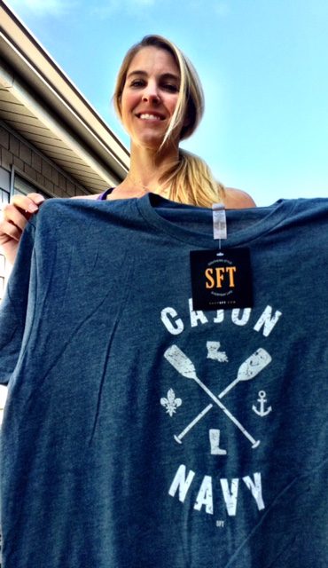 On the way back to Baton Rouge, I stopped by SFT, a local t-shirt maker, to pick up some Cajun Navy t-shirts. Meredith Waguespack (left) designed them and sells them online. You can buy one here. She says that $15 from every one sold goes to flood relief through the Baton Rouge Area Foundation’s fund to restore the Baton Rouge Food Bank, which was nearly wiped out by the flood. It’s a great way to celebrate the strength of Louisiana and its people, and to restore a local agency that feeds the hungriest in our city. Meredith says they’ve already raised $30,000 for the Food Bank through the online sale of these t-shirts.