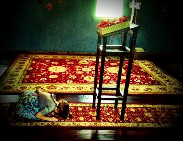 That’s my daughter Nora, who was six when this picture was taken, early in the life of the mission. She is bowing before the Holy Cross, which lays flat among flowers atop this stand. St. John’s was where my little girl learned to prostrate herself before the Cross. Don’t misunderstand — other Orthodox churches do this too. But this is where she learned it. It’s where I learned it too, in my bones. I’ve been doing this since I became Orthodox in 2006, but life in the mission made Orthodoxy real for me in a way that it had not been before.