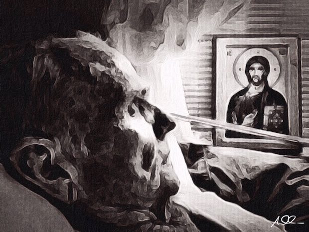 Ray Dreher on his deathbed, August 2015 (Photo illustration by Rod Dreher)
