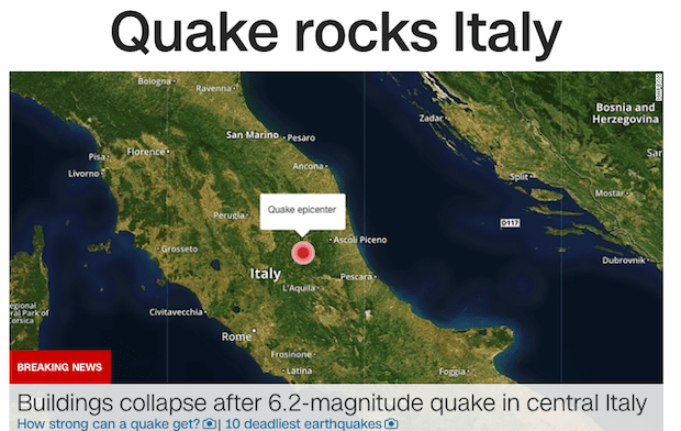 CNN reporting catastrophic earthquake in central Italy. The epicenter is very close to Norcia. The monks are reportedly okay, and in the piazza with people. This tweet shows damage inside the basilica at the Norcia monastery: