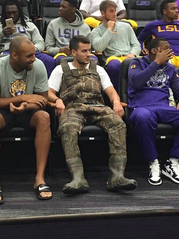 And so on and so forth. This photo below has been going around Facebook. It pretty much sums up the view from here. LSU had a meeting the other day of its football team. The guy in the camo is the team kicker, Colby Delahoussaye, a Cajun who had been doing what Cajuns all over south Louisiana are doing right now. Perspective, folks. Perspective: