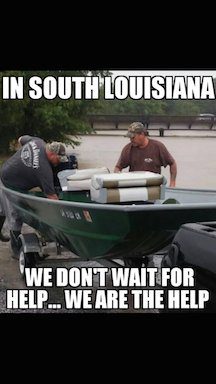 Remember my telling you about Thomas Achord, the young teacher of ancient Greek at Sequitur Classical Academy here in Baton Rouge? He’s the guy who wrote the beautiful Facebook comment I featured here on Sunday, about how much a disaster like this makes him realize how much he loves Louisiana. He’s part of the unofficial Cajun Navy, the ragtag but huge number of Louisiana men with boats who hit the water to save people. These men are the very best of Louisiana, and of America. Nobody told them to do it. They went, because that’s what men like them do. This is going around social media down here. It’s not bragging if it’s true: