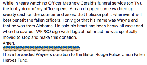 My wife directed me to this Facebook post by a friend of ours who works for the West Feliciana Parish Sheriff’s Office, headquartered on Highway 61. I’ve taken her name off the top in the screen grab, because the important thing is this man’s deed. Look:
