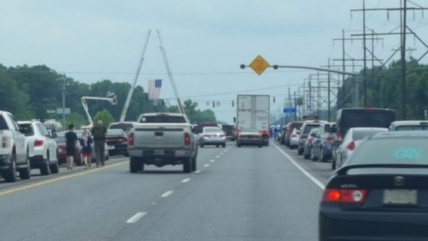 UPDATE: My wife is on her way to Baton Rouge. She sends this photo below of traffic on Highway 61. Officer Gerald’s funeral cortege is passing by. His is the first of three police officer funerals we will have locally in the next few days. This is going to happen with each man — all slain by Gavin Long. Everyone is pulled over to do him honor. One of the great things about living in the South is people here still pull over on the shoulder of the road when a funeral procession goes by.